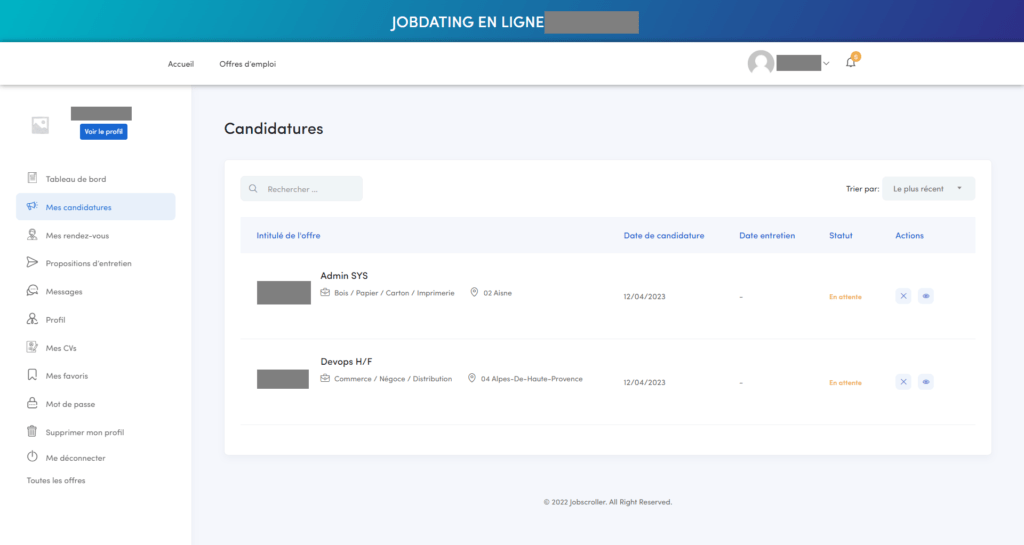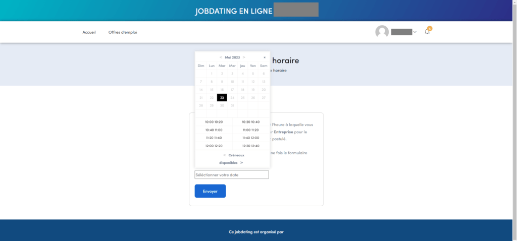 Une fois connecté(e) à votre compte accédez à la section « candidatures » dans la barre latérale pour visualiser les statuts de candidatures. Ce jobdating est prévu pour que vous puissiez choisir un créneau horaire directement dans l’agenda des recruteurs pour les offres auxquelles vous avez postulé. Accédez à vos propositions d’entretiens dans l’onglet du même nom pour vérifier si vous avez des créneaux d’entretien à sélectionner.Propositions d’entretiens