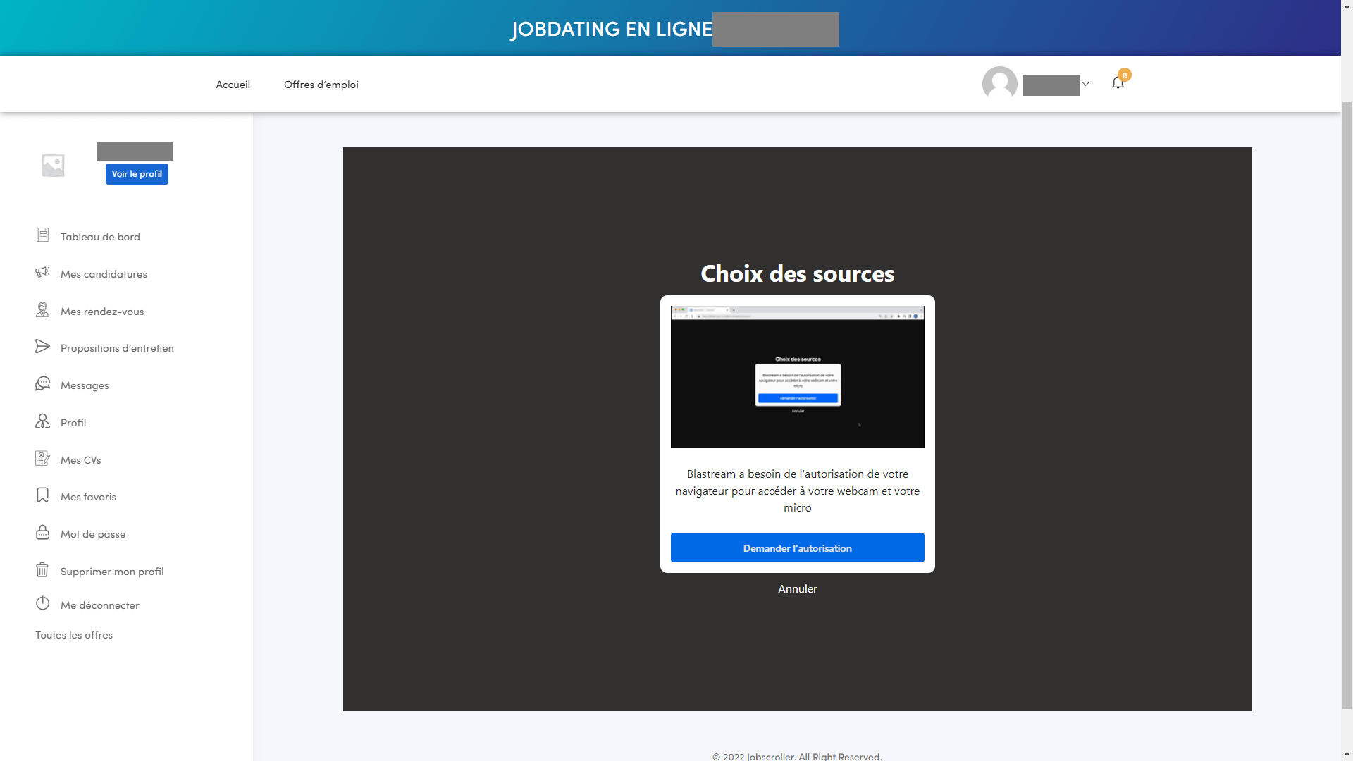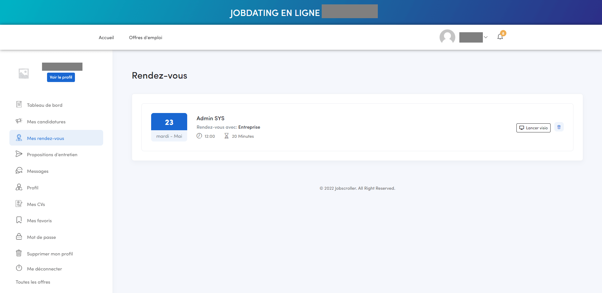 Le jour de l’entretien, allez sur cette page et cliquez sur le bouton « Lancer la visio » du rendez-vous.