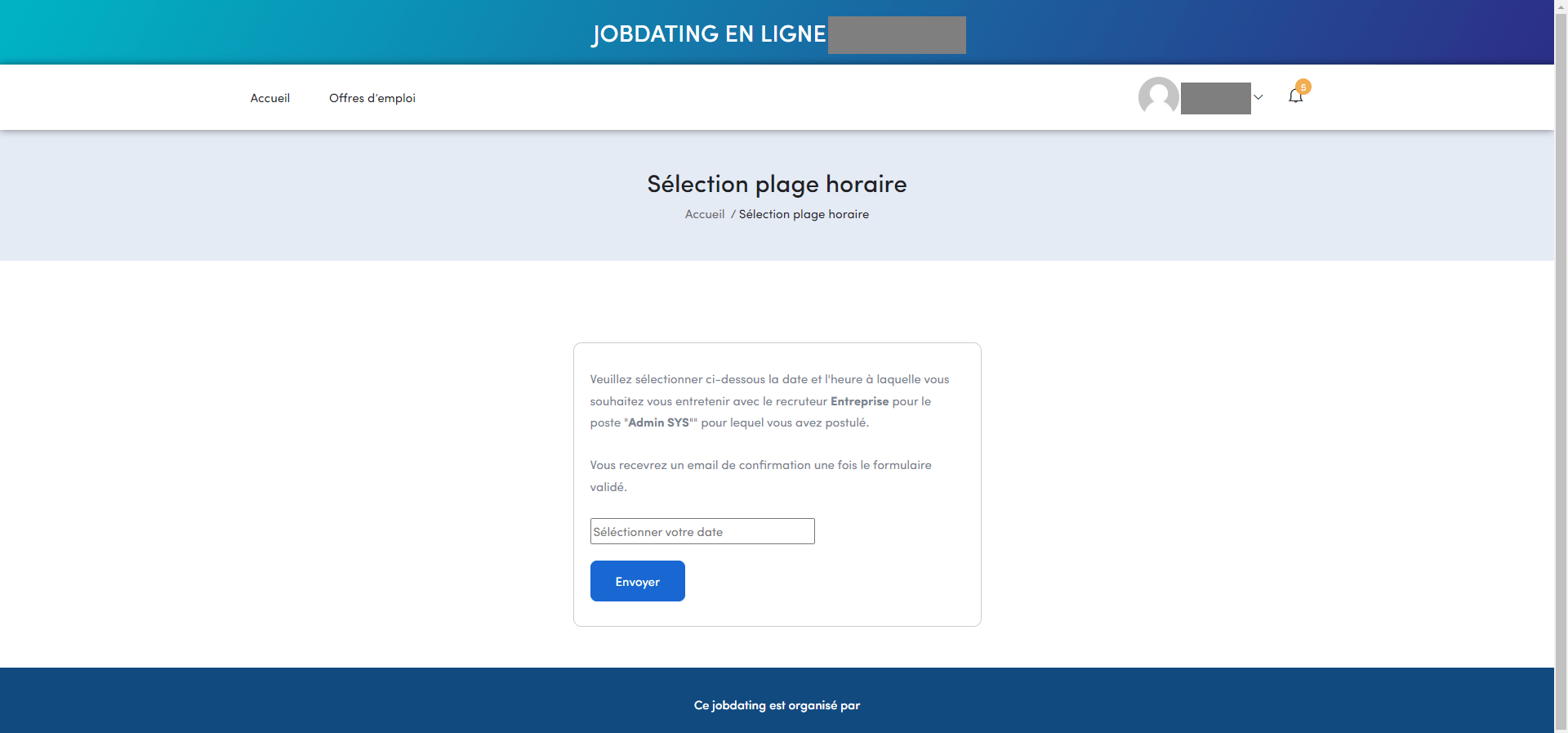 Cliquez sur le bouton « Sélectionner une date » pour accéder à la page de choix de créneau d’entretien avec le recruteur.