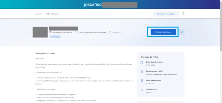 – Lorsque vous êtes sur la liste des offres, cliquez sur une offre. – Cliquez ensuite sur le bouton « Postuler » (entouré en bleu sur la capture d’écran ci-contre). – Une popup s’ouvre, sélectionnez ou ajoutez votre CV, ajoutez un message à destination du recruteur et validez. Un message de confirmation s’affiche et vous recevrez un email de confirmation de votre candidature. Vous pourrez ensuite choisir directement un créneau dans l’agenda du recruteur. Si vous ne sélectionnez pas tout de suite de créneau horaire, vous pourrez retrouver toutes vos propositions d’entretien dans l’onglet du même nom.Voir mes candidatures