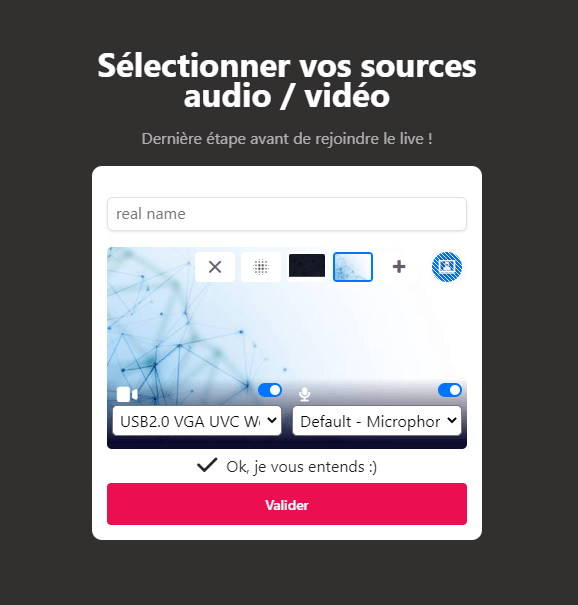 Vous pouvez ensuite valider ou modifier la sélection des sources audio/vidéo, avant de valider et rejoindre l’entretien.